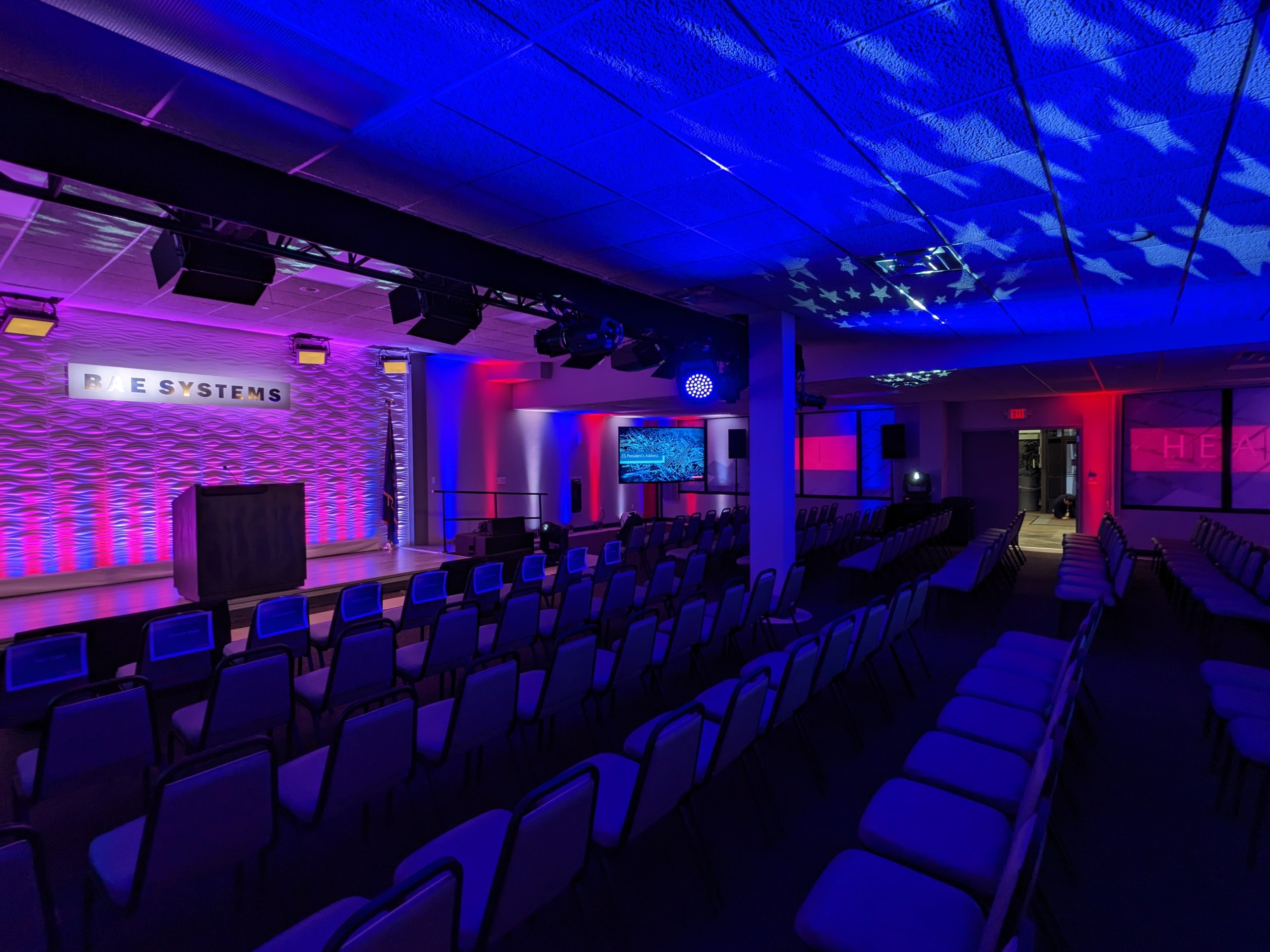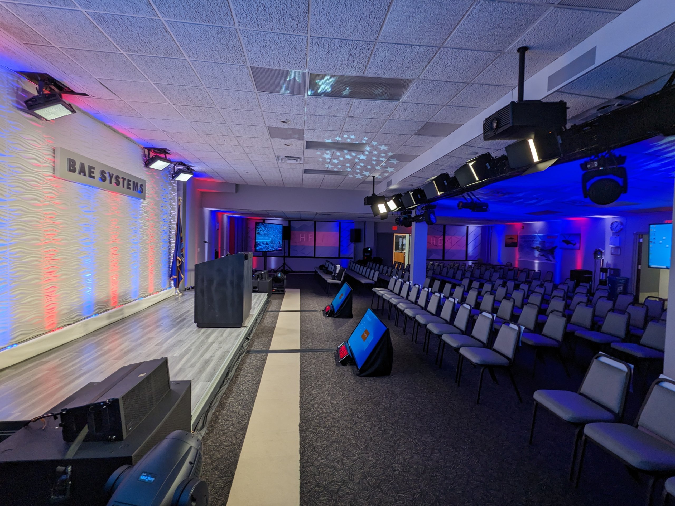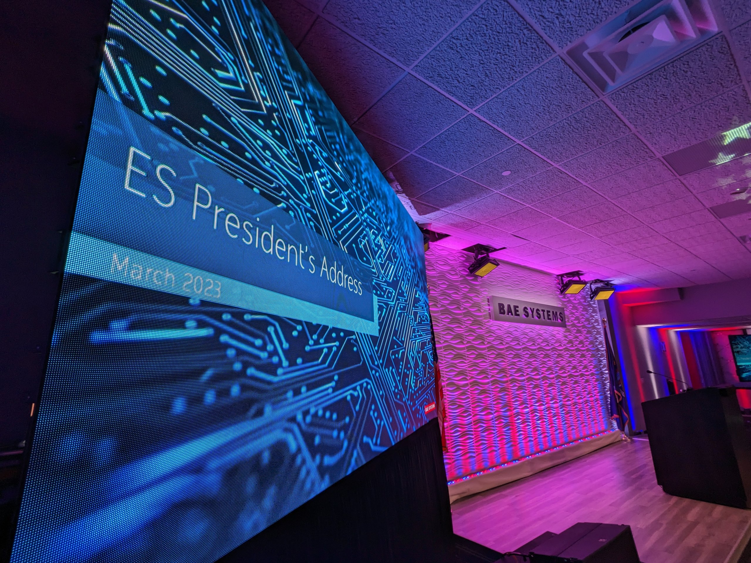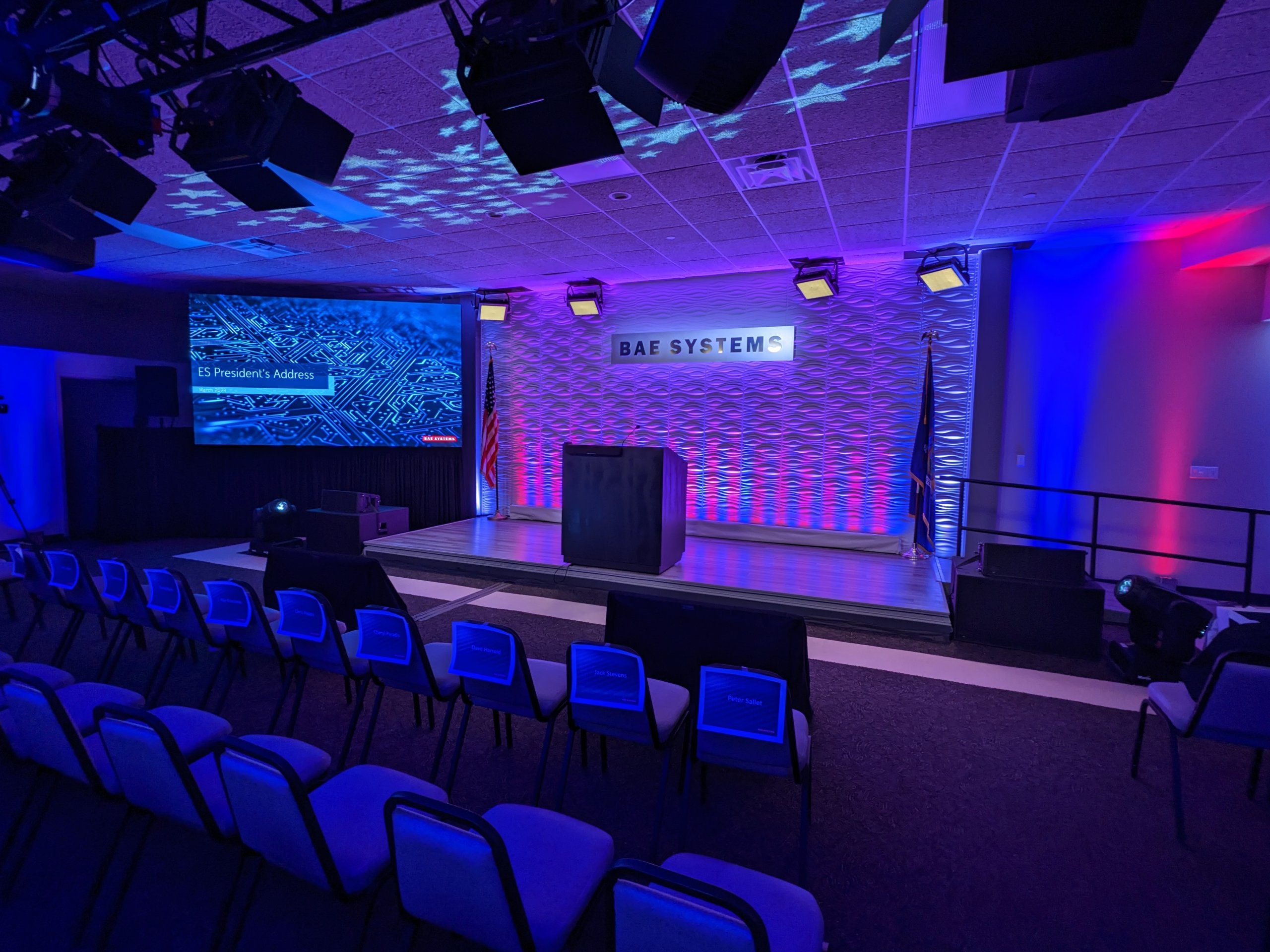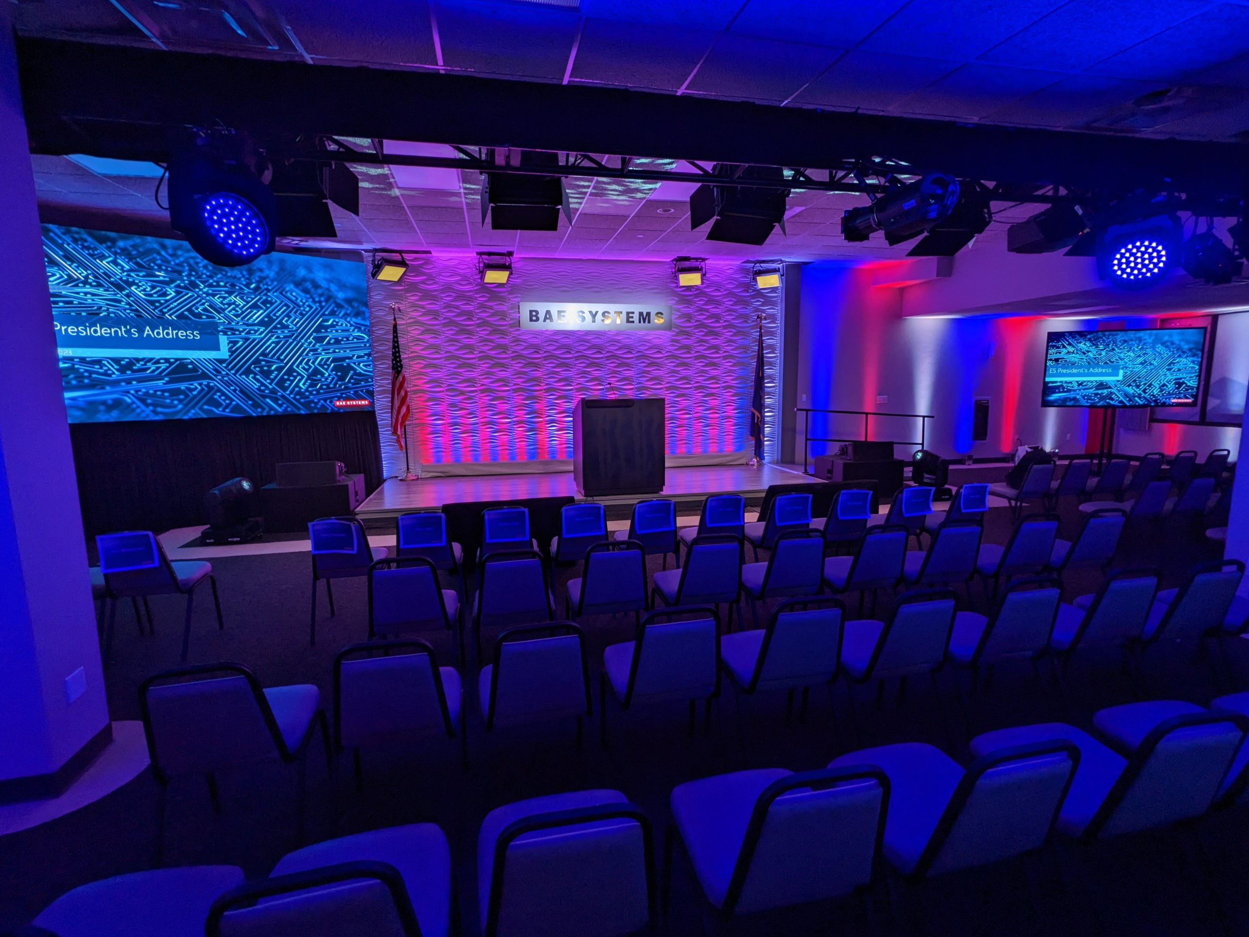 In support of our client Mark Brown from Ovations LLC, and his client BAE Systems Electronic Systems, we provided complete video, audio, lighting, rigging, and production services for for their 2023 President’s Address. The program originated from this client’s facility in Greenlawn NY, where a local audience of about 150 people gathered in an auditorium which we transformed into a hybrid event space / broadcast studio. Thousands of others participated virtually from around the country.