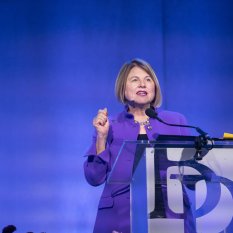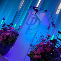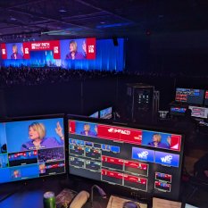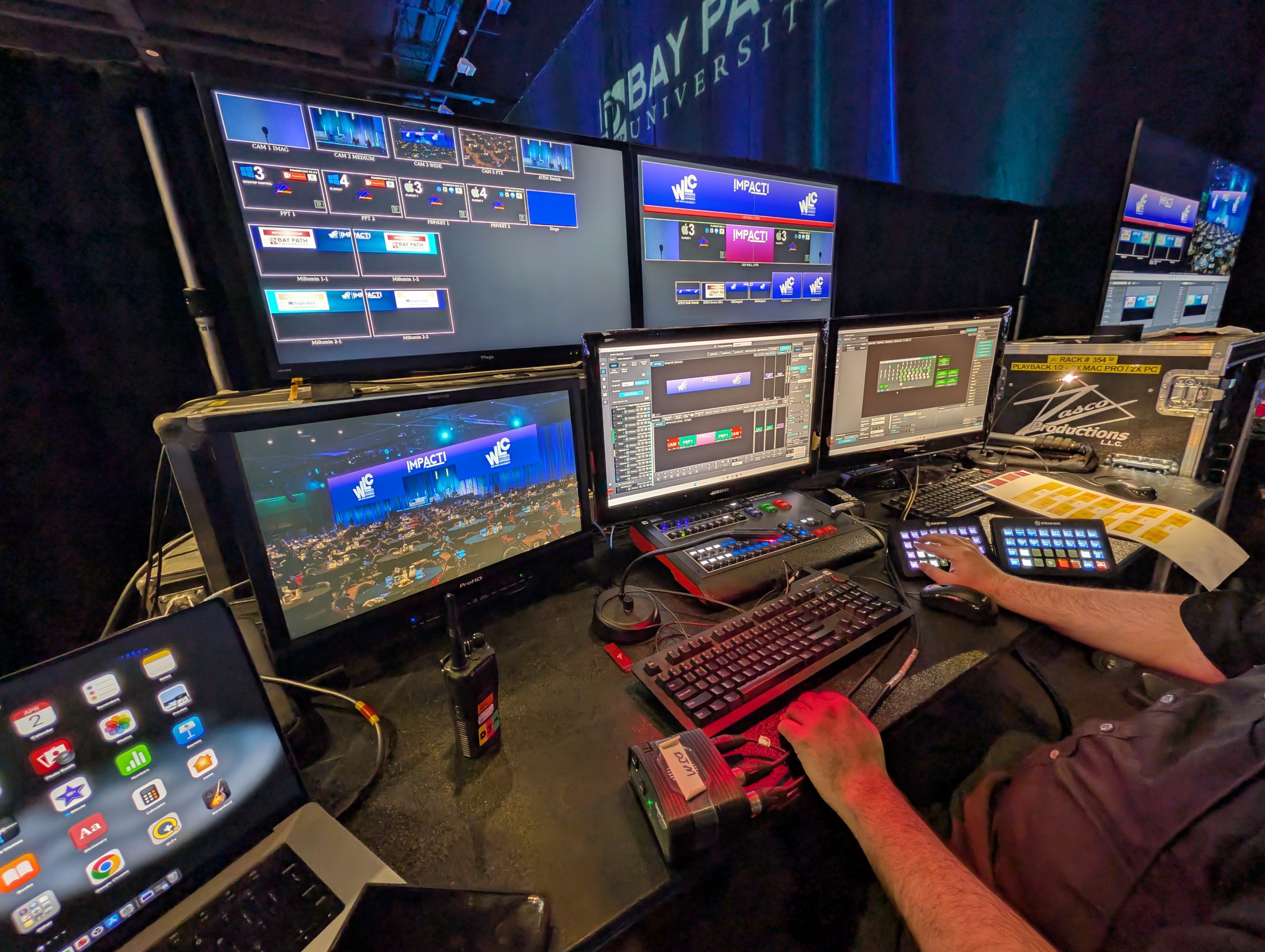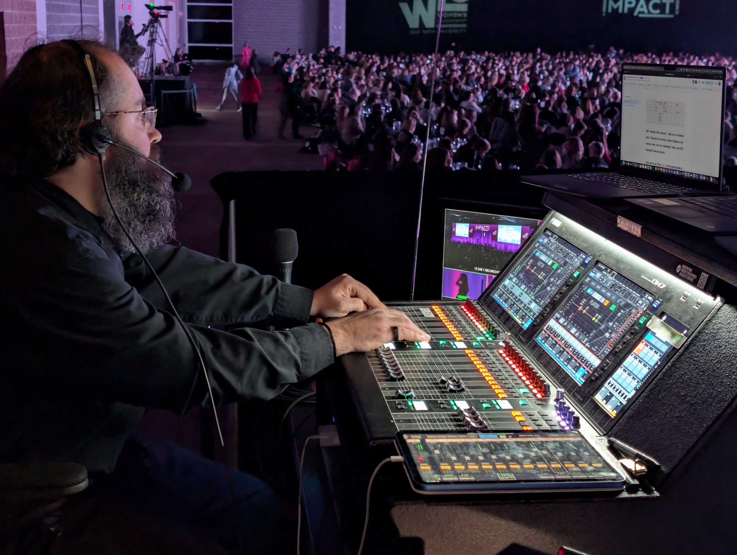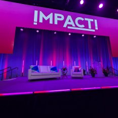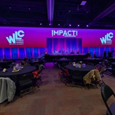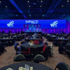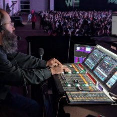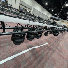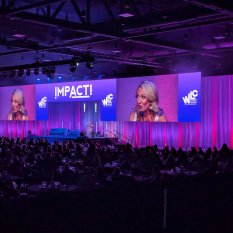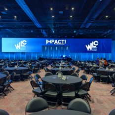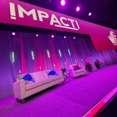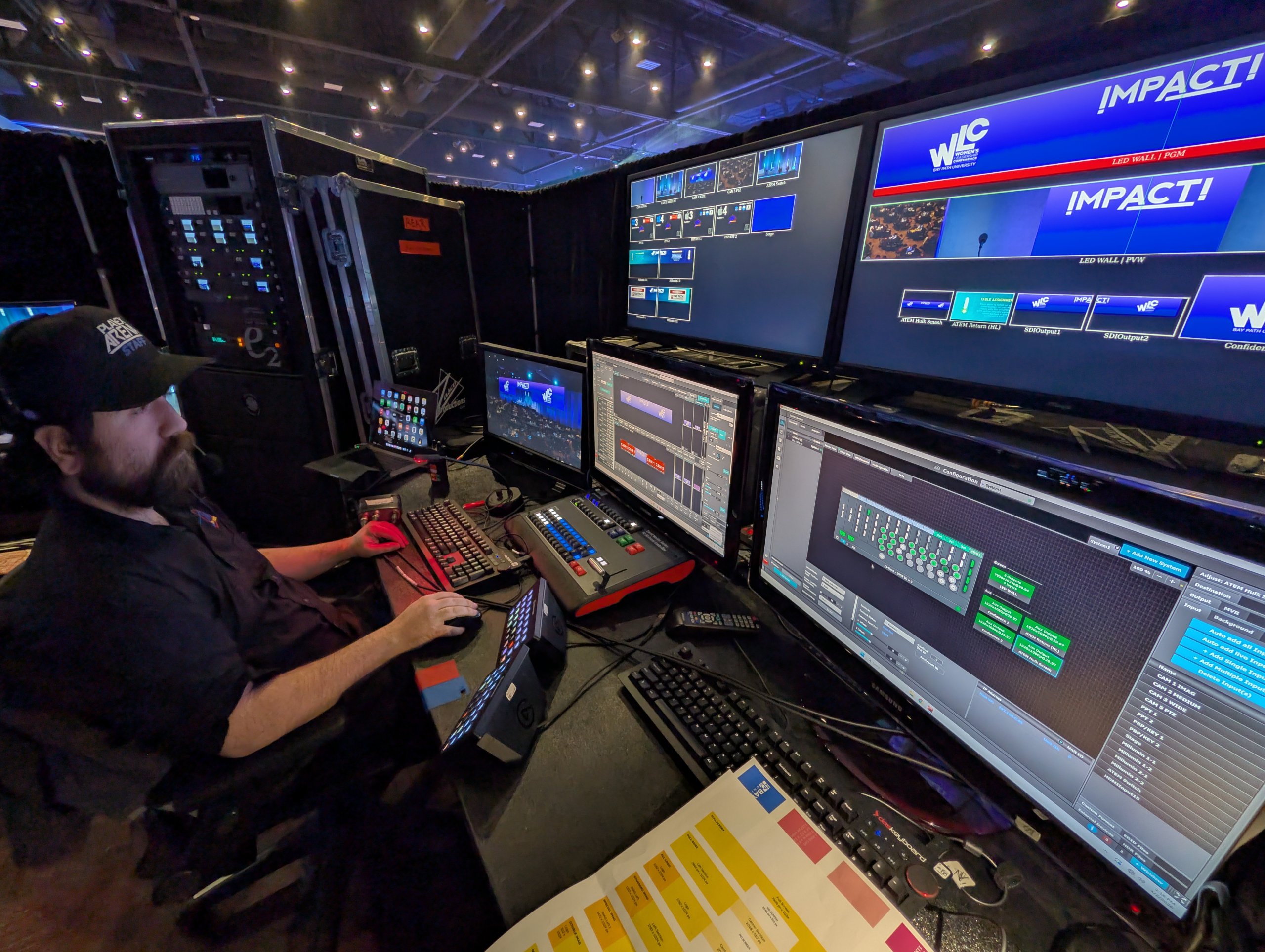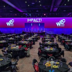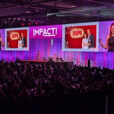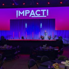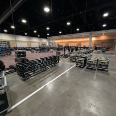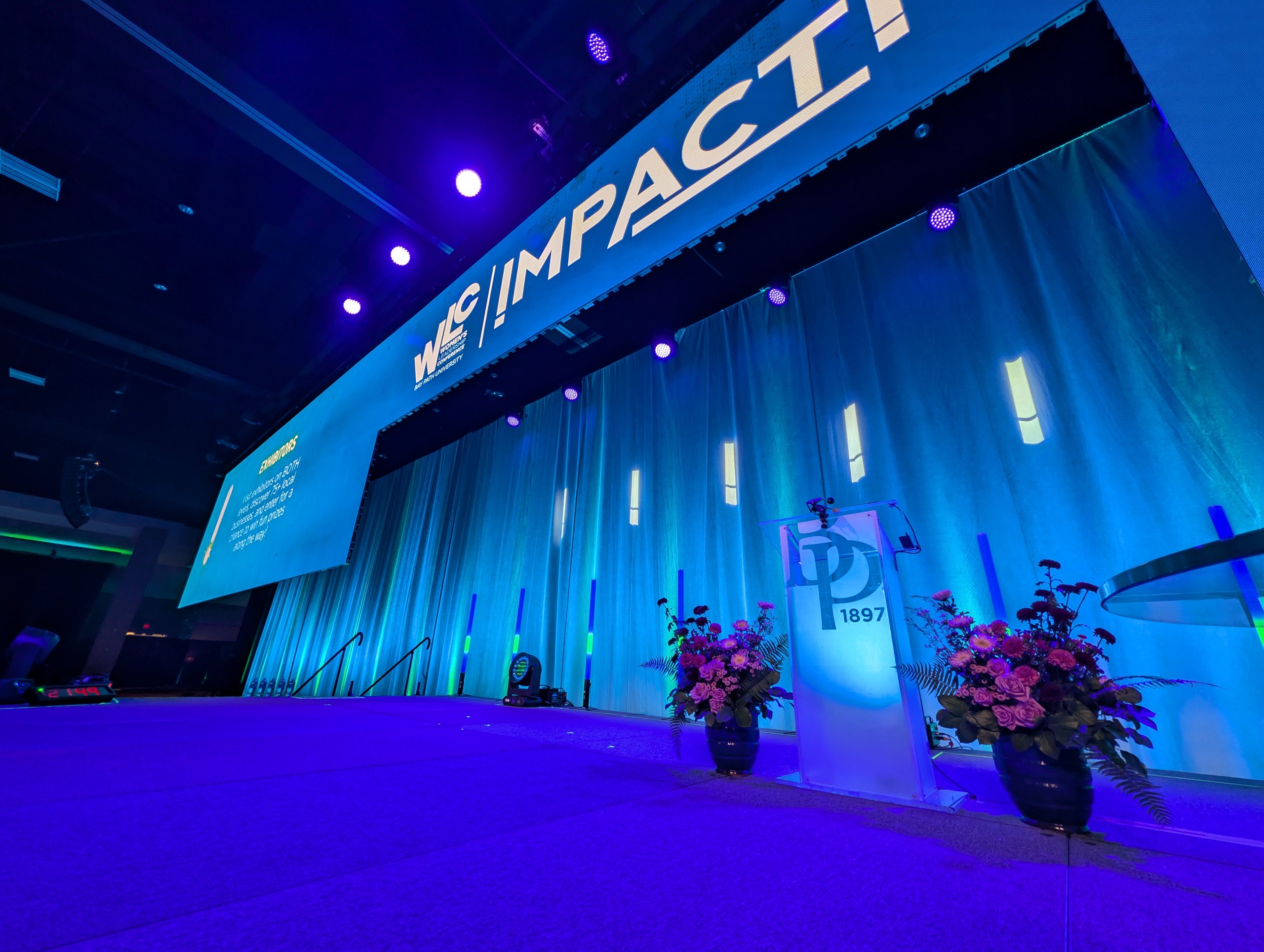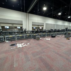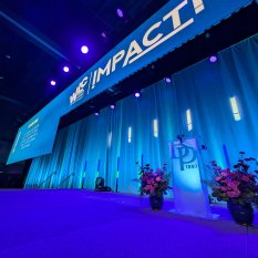 We transformed the MassMutual Center Exhibition Hall into an impactful experience for an audience of 1600 people. Using a 101 foot wide high resolution LED video wall to display combinations of presentations, I-MAG, and full-screen graphics, every member of the audience was able to enjoy the presentation, regardless of where they were seated. Sound reinforcement was equally important. A carefully designed and deployed line-array system with state-of-the art digital mixing and processing equipment enabled us to deliver crystal clear, highly intelligible audio to every seat, in this otherwise very reverberant space. Video production included a 4-camera production for both recording and I-MAG. Lighting included over 200 units with LED moving lights for both broadcast quality illumination for the cameras as well as theatrical lighting for special visual effects.
