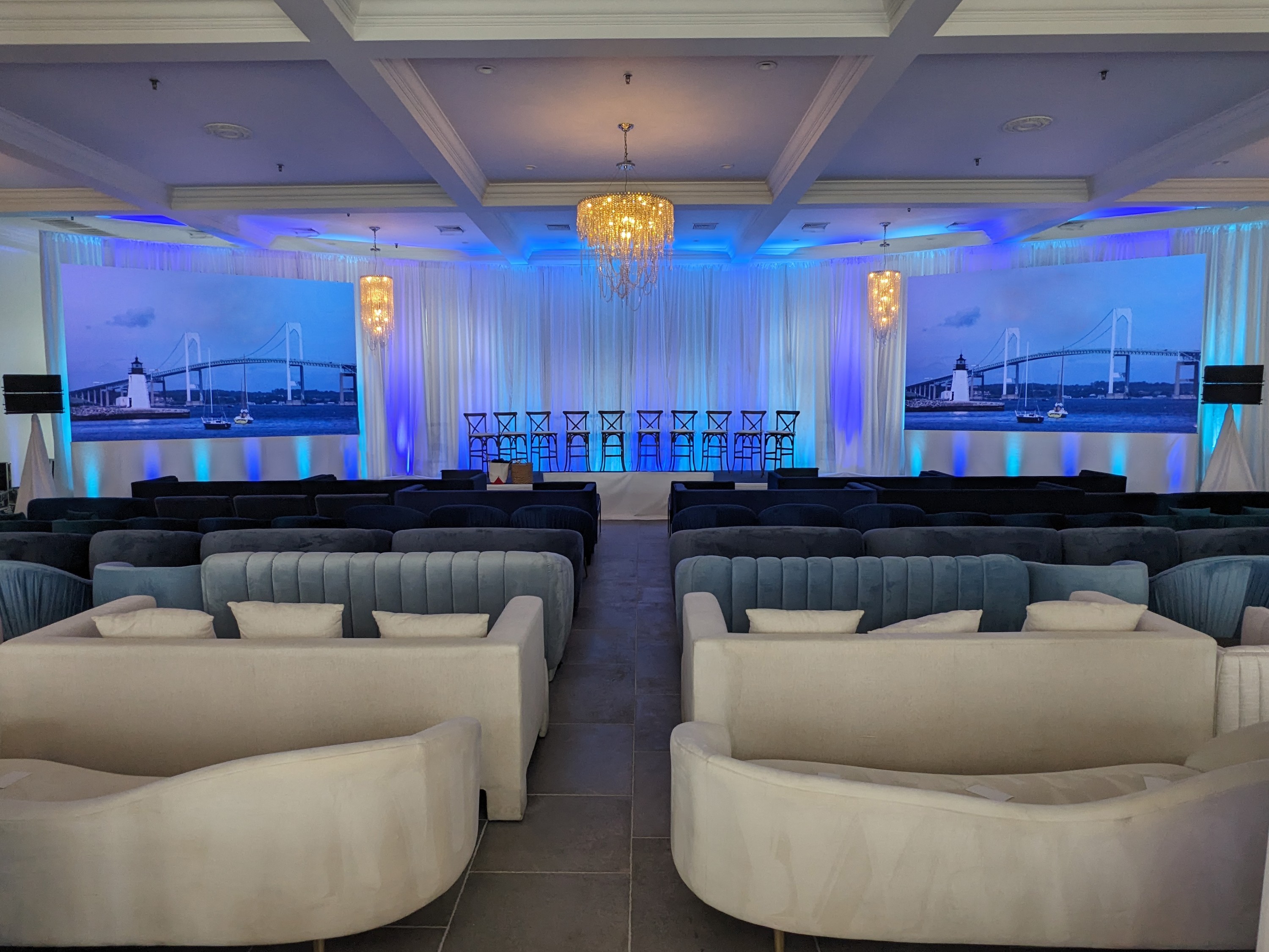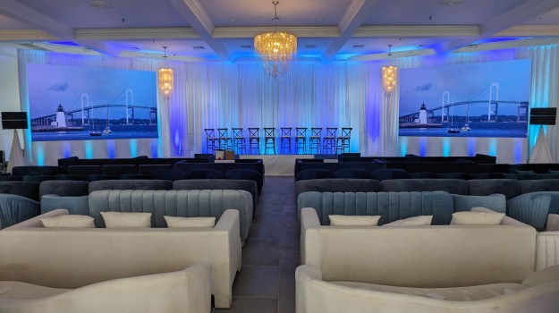 Using white drape, thoughtful lighting design, and high-resolution indoor LED video walls, we set the stage for this client’s leadership meeting. We provided exceptional quality audio / visual presentation, while keeping the setup consistent with their theme and this beautiful ocean front venue.